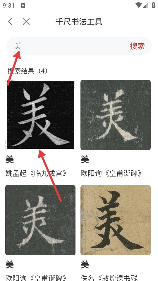 3、接着在搜索栏输入目标汉字(如“美”),点击搜索。