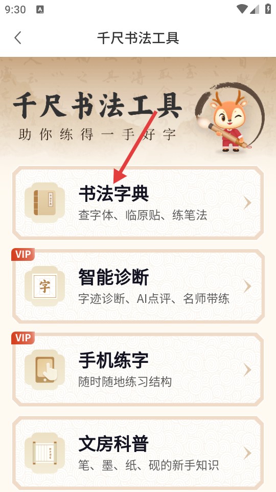 2、在工具页,选择【书法字典】功能模块进入。