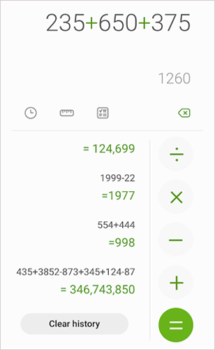 三星计算器是一款手机计算器软件。该软件最大的优势是为三星手机内置,零延迟,随叫随用,非常方便。该软件从基本的加减乘除到更高级的工程计算和单位转换,功能非常强大,还能适用于各种场合。无论你是学生还是普通用户,还是工程师、科学家,都能在日常生活和工作中找到它的用武之地,非常的方便好用。感兴趣的朋友快来下载试试吧!