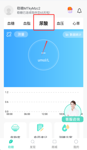 2、在尿酸记录模块输入定期检测的数值,系统将自动保存并生成长期变化趋势图表。