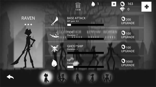 1、进入游戏后会出现五位不同的火柴人,除了第一位初始火柴人之外,剩余的需要利用金币和砖石来进行解锁