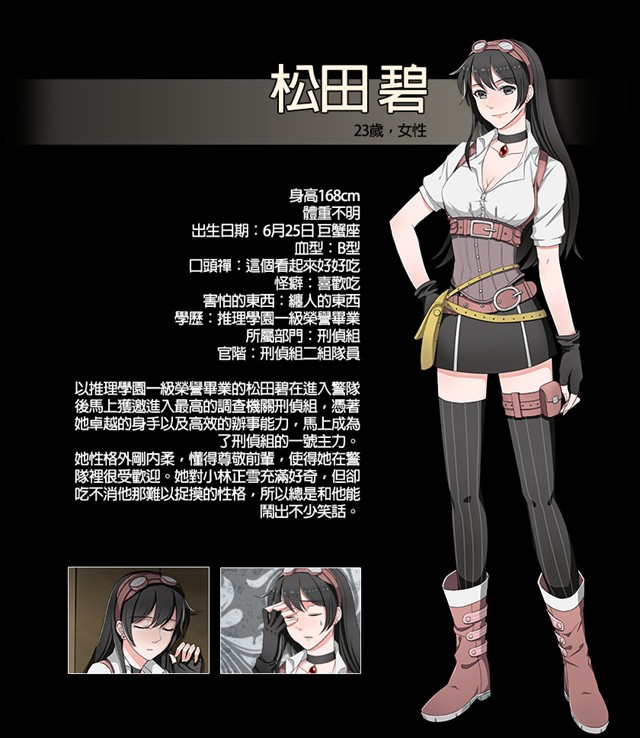 以推理学园一级荣誉毕业的松田碧在进入警队后马上获邀进入最高的调查机关刑侦组,凭着她卓越的身手以及高效的办事能力,马上成了刑侦组的一号主力。她性格外刚内柔,懂得尊敬前辈,使得她在警队很受欢迎。她对小林正雪充满好奇,但吃不消他那难以捉摸的性格,所以总是和他能闹出不少笑话。