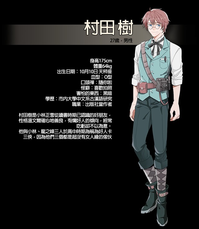 村田树是小林正雪从读书时期已认识的好朋友,性格温文尔确心地善良,有烂好人的倾向,经常吃亏不以为意。他与小林、龙之峰三人于高中时期称好人卡三侠,因他们三个都是超有女人缘的家伙