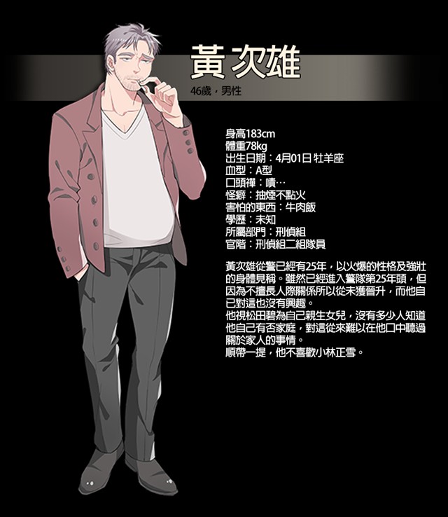 次雄从警已经有25年,以火爆的性格及强壮的身体见称。虽然已经进入警队第25年头,但因不擅长人际关系所以从未获升,而他自已对这也有兴趣。他视松田碧自己亲生女儿,有多少人知道他自己有否家庭,对这从来难以在他口中听过关于家人的事情。顺带一提,他不喜欢小林正雪。