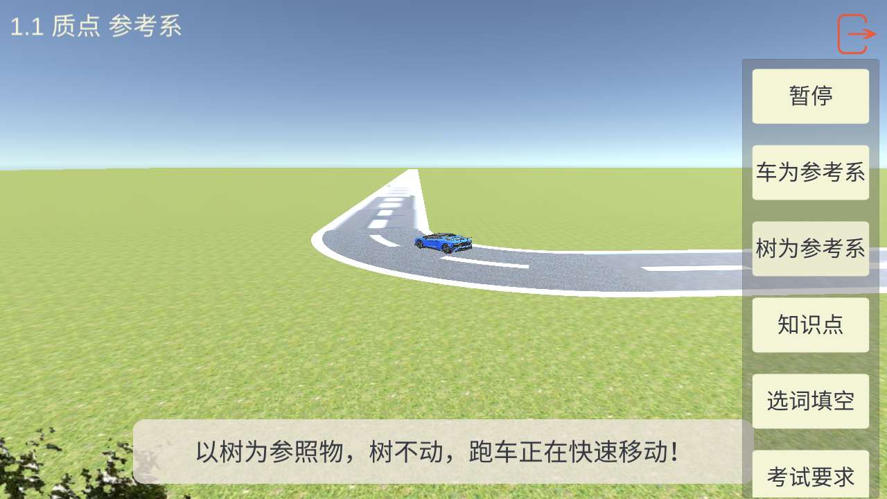 ⑤点击“开始”,车就跑了起来,我们再选择“以车为参考系”还是“以树为参考系”,非常的直观,有助于帮助大家理解。
