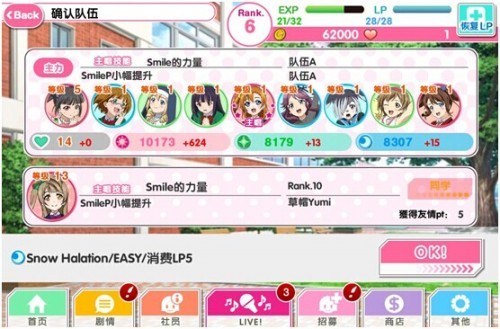 还是这张图,右侧有该社员的技能和主唱技能,技能名称右侧为该技能的等级和技能点数,可通过相同技能的卡片或提升甜美社员技能点数的支援社员提升,主唱技能无法提升,只有在主唱位置才会生效(最中间的五号位)