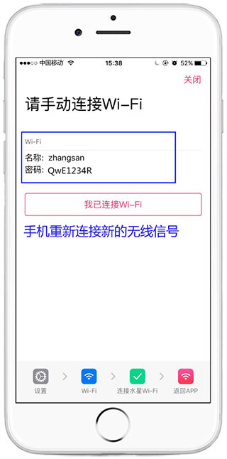 6、完成设置,重新连接无线信号。至此,路由器设置完成。手机重新搜索新设置的无线名称,输入无线密码,连接上无线信号即可上网。设置完成,手机重新连接无线信号。其他无线终端(手机、Pad等),只需连接上路由器的无线信号就可以实现上网;其他有线终端(台式机等),只需使用一根网线将其连接到路由器任意空闲的LAN口即可上网;无需再设置路由器。