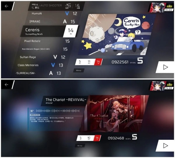 这两首歌都有分数限制,「Chronostasis」是需要88w以上的分数,「Glaciaxion」是需要96w以上的分数,通过之后解锁「Rrhar'il」