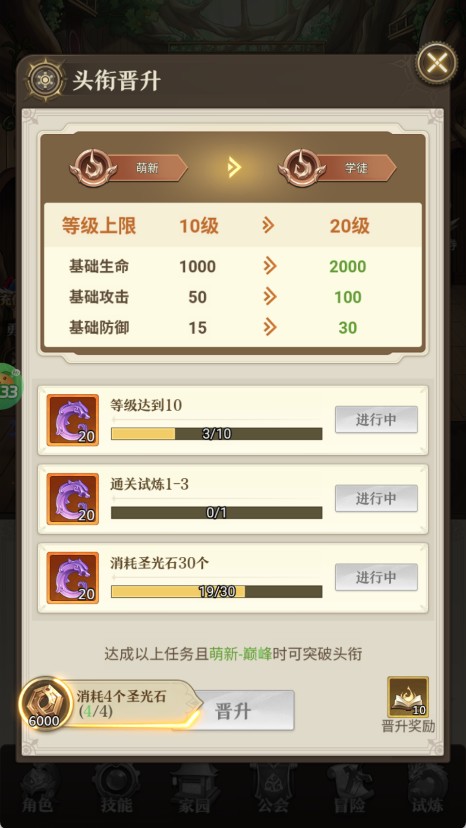5、当新手玩家成长到一定阶段后,还能进行【晋升】,不仅能解锁更多玩法,还会获得丰厚的奖励加成。