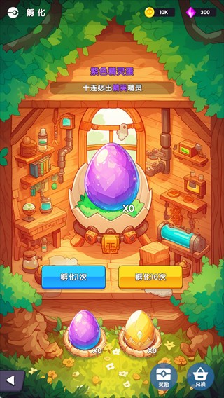 消耗道具孵化精灵蛋,紫色精灵蛋十连必出精英精灵,是获取强力伙伴的核心途径。
