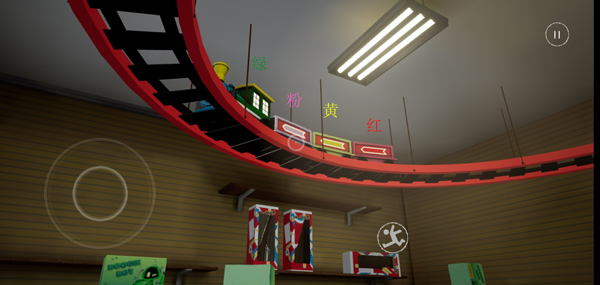 1、打开波比的游戏时间第一章手机版,进入游戏后右边进门抬头可以看到一辆火车,颜色分别为绿粉黄红,这就是第一章密码门的颜色按钮顺序。