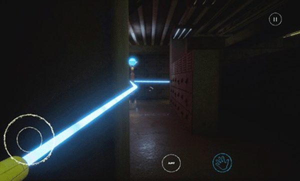5、当手套收集完成会自动的带入手中,这个时候可以看到在墙的两侧有红色、蓝色的手印,玩家只需要将手套对着相对应的区域即可将房门打开。