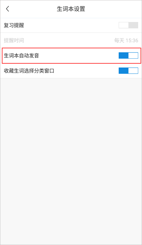 2、接着点击生词本自动发音开关即可自动发音啦。